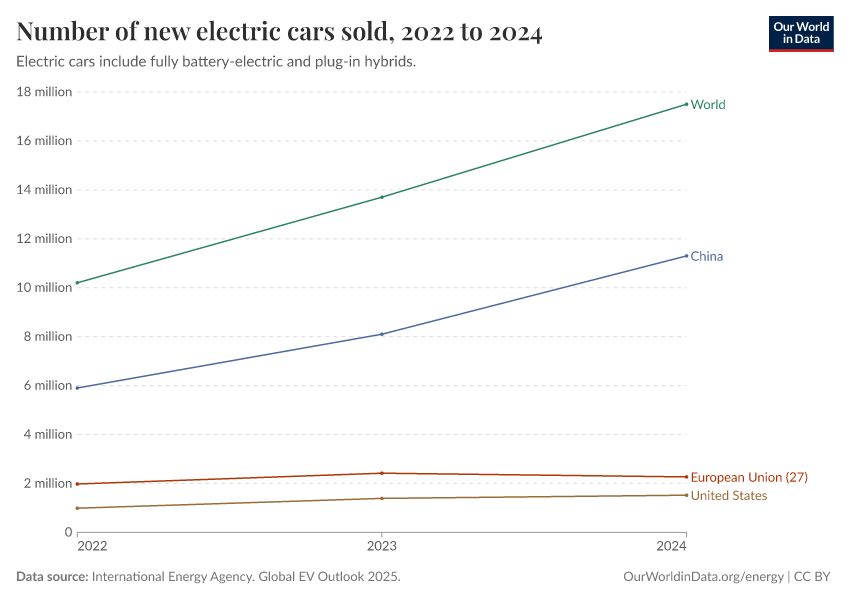 “Data Page: Number of new electric cars sold”. Our World in Data (2026). Data adapted from International Energy Agency. Global EV Outlook 2025.. Retrieved from https://archive.ourworldindata.org/20250909-093708/grapher/electric-car-sales.html [online resource] (archived on September 9, 2025).How to cite this data