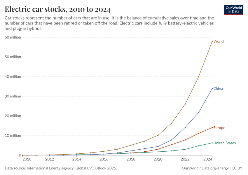 “Data Page: Electric car stocks”. Our World in Data (2026). Data adapted from International Energy Agency. Global EV Outlook 2025.. Retrieved from https://archive.ourworldindata.org/20260304-094028/grapher/electric-car-stocks.html [online resource] (archived on March 4, 2026).How to cite this data