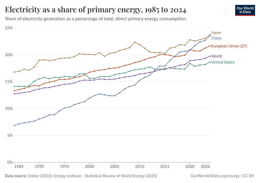 Ember (2026); Energy Institute - Statistical Review of World Energy (2025) – with major processing by Our World in Data. “Total electricity generation as share of primary energy” [dataset]. Ember, “Yearly Electricity Data Europe”; Ember, “Yearly Electricity Data”; Energy Institute, “Statistical Review of World Energy” [original data]. Retrieved March 9, 2026 from https://archive.ourworldindata.org/20260304-094028/grapher/electricity-as-a-share-of-primary-energy.html (archived on March 4, 2026).