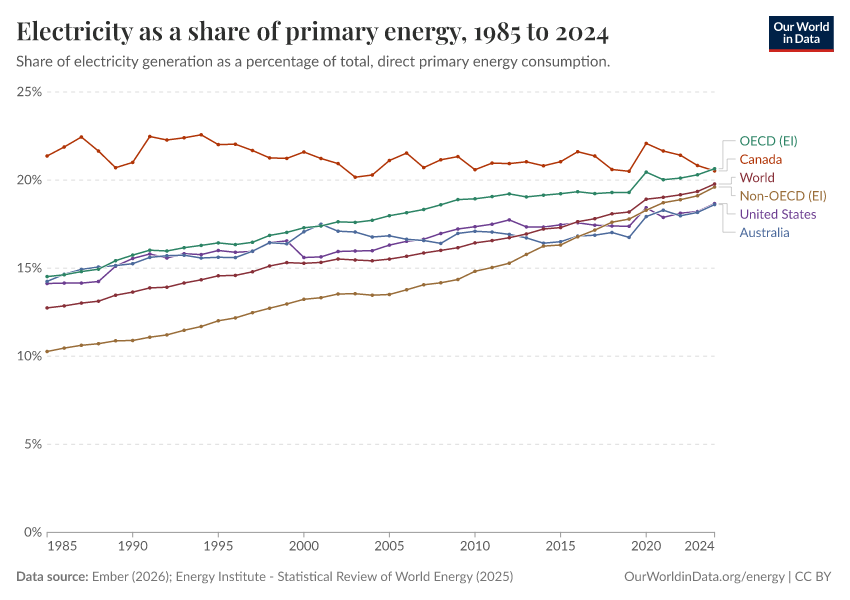 Ember (2026); Energy Institute - Statistical Review of World Energy (2025) – with major processing by Our World in Data. “Total electricity generation as share of primary energy” [dataset]. Ember, “Yearly Electricity Data Europe”; Ember, “Yearly Electricity Data”; Energy Institute, “Statistical Review of World Energy” [original data]. Retrieved January 16, 2026 from https://archive.ourworldindata.org/20260109-144605/grapher/electricity-as-a-share-of-primary-energy.html (archived on January 9, 2026).