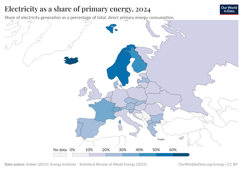 “Data Page: Total electricity generation as share of primary energy”, part of the following publication: Hannah Ritchie, Pablo Rosado, and Max Roser (2023) - “Energy”. Data adapted from Ember, Energy Institute. Retrieved from https://archive.ourworldindata.org/20251007-073458/grapher/electricity-as-a-share-of-primary-energy.html [online resource] (archived on October 7, 2025).How to cite this data