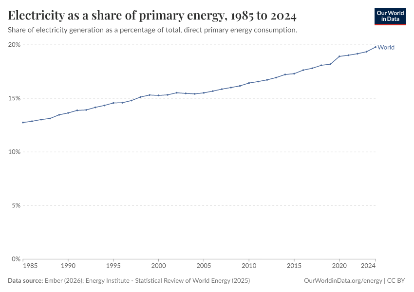 Ember (2026); Energy Institute - Statistical Review of World Energy (2025) – with major processing by Our World in Data. “Total electricity generation as share of primary energy” [dataset]. Ember, “Yearly Electricity Data Europe”; Ember, “Yearly Electricity Data”; Energy Institute, “Statistical Review of World Energy” [original data]. Retrieved January 12, 2026 from https://archive.ourworldindata.org/20260109-144605/grapher/electricity-as-a-share-of-primary-energy.html (archived on January 9, 2026).