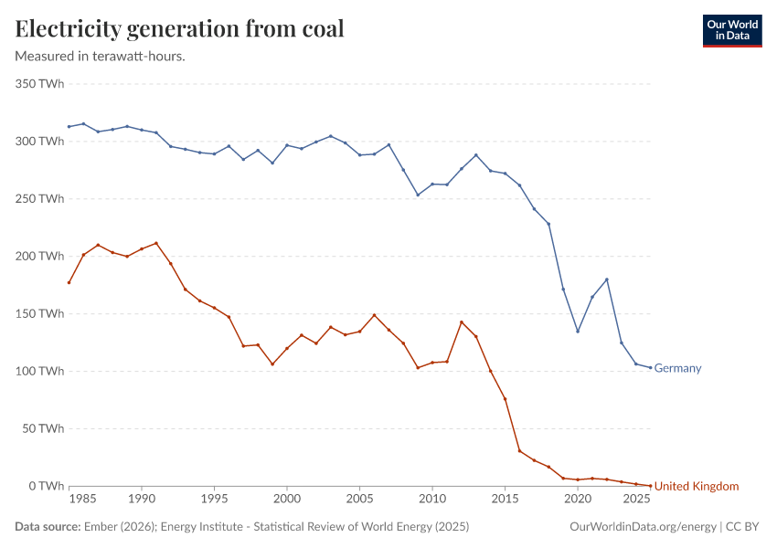 Ember (2026); Energy Institute - Statistical Review of World Energy (2025) – with major processing by Our World in Data. “Electricity generation from coal” [dataset]. Ember, “Yearly Electricity Data Europe”; Ember, “Yearly Electricity Data”; Energy Institute, “Statistical Review of World Energy” [original data]. Retrieved April 19, 2026 from https://archive.ourworldindata.org/20260417-112857/grapher/electricity-coal.html (archived on April 17, 2026).