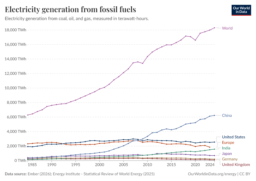 “Data Page: Electricity generation from fossil fuels”, part of the following publication: Hannah Ritchie, Pablo Rosado, and Max Roser (2023) - “Energy”. Data adapted from Ember, Energy Institute. Retrieved from https://archive.ourworldindata.org/20260109-144605/grapher/electricity-fossil-fuels.html [online resource] (archived on January 9, 2026).How to cite this data