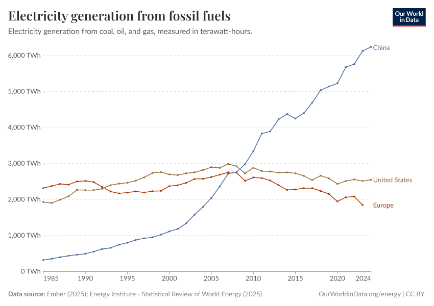 Ember (2025); Energy Institute - Statistical Review of World Energy (2025) – with major processing by Our World in Data. “Electricity generation from fossil fuels – Ember” [dataset]. Ember, “Yearly Electricity Data Europe”; Ember, “Yearly Electricity Data”; Energy Institute, “Statistical Review of World Energy” [original data]. Retrieved December 31, 2025 from https://archive.ourworldindata.org/20250909-093708/grapher/electricity-fossil-fuels.html (archived on September 9, 2025).