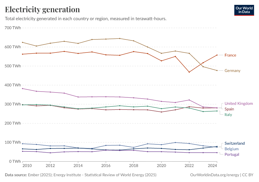 “Data Page: Total electricity generation”, part of the following publication: Hannah Ritchie, Pablo Rosado, and Max Roser (2023) - “Energy”. Data adapted from Ember, Energy Institute. Retrieved from https://archive.ourworldindata.org/20250909-093708/grapher/electricity-generation.html [online resource] (archived on September 9, 2025).How to cite this data