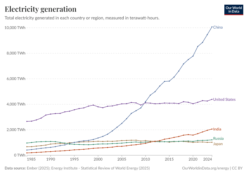 “Data Page: Total electricity generation”, part of the following publication: Hannah Ritchie, Pablo Rosado, and Max Roser (2023) - “Energy”. Data adapted from Ember, Energy Institute. Retrieved from https://archive.ourworldindata.org/20250909-093708/grapher/electricity-generation.html [online resource] (archived on September 9, 2025).How to cite this data