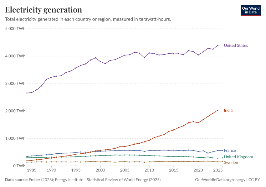 “Data Page: Total electricity generation”, part of the following publication: Hannah Ritchie, Pablo Rosado, and Max Roser (2023) - “Energy”. Data adapted from Ember, Energy Institute. Retrieved from https://archive.ourworldindata.org/20260203-171503/grapher/electricity-generation.html [online resource] (archived on February 3, 2026).