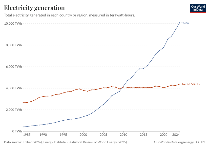 “Data Page: Total electricity generation”, part of the following publication: Hannah Ritchie, Pablo Rosado, and Max Roser (2023) - “Energy”. Data adapted from Ember, Energy Institute. Retrieved from https://archive.ourworldindata.org/20250909-093708/grapher/electricity-generation.html [online resource] (archived on September 9, 2025).How to cite this data