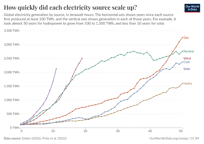 Ember (2026); Pinto et al. (2023) – with major processing by Our World in Data. “How quickly did each electricity source scale up?” [dataset]. Ember, “Yearly Electricity Data Europe”; Ember, “Yearly Electricity Data”; Pinto et al., “Global historical electricity” [original data]. Retrieved February 24, 2026 from https://archive.ourworldindata.org/20260212-084537/grapher/electricity-source-scale-up.html (archived on February 12, 2026).
