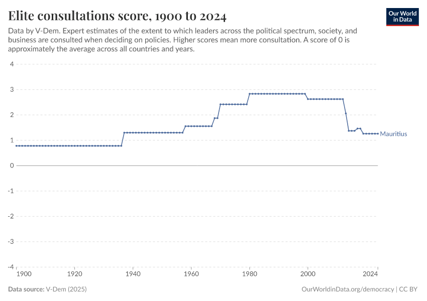 “Data Page: Elite consultation”, part of the following publication: Bastian Herre, Lucas Rodés-Guirao, and Esteban Ortiz-Ospina (2013) - “Democracy”. Data adapted from V-Dem. Retrieved from https://archive.ourworldindata.org/20250925-233948/grapher/elite-consultations-score.html [online resource] (archived on September 25, 2025).How to cite this data