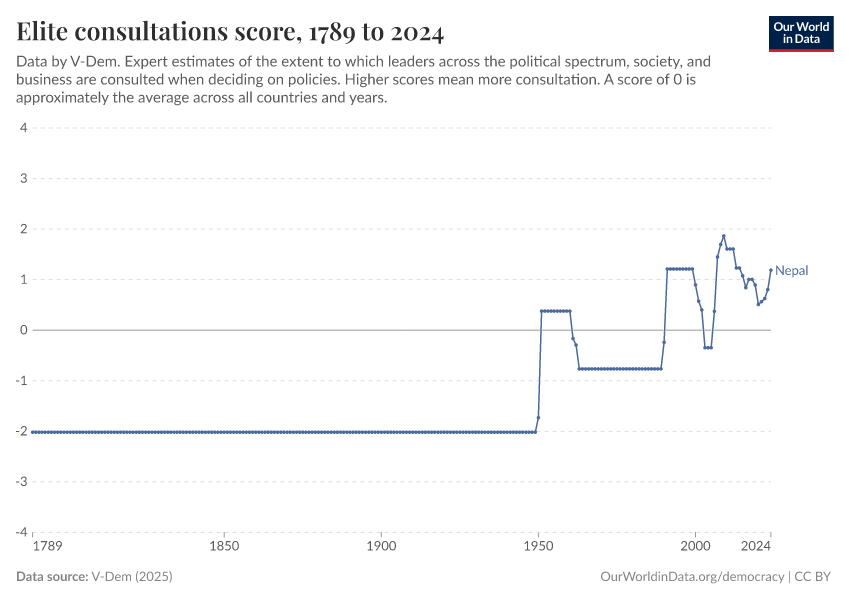 “Data Page: Elite consultation”, part of the following publication: Bastian Herre, Lucas Rodés-Guirao, and Esteban Ortiz-Ospina (2013) - “Democracy”. Data adapted from V-Dem. Retrieved from https://archive.ourworldindata.org/20250925-233948/grapher/elite-consultations-score.html [online resource] (archived on September 25, 2025).How to cite this data