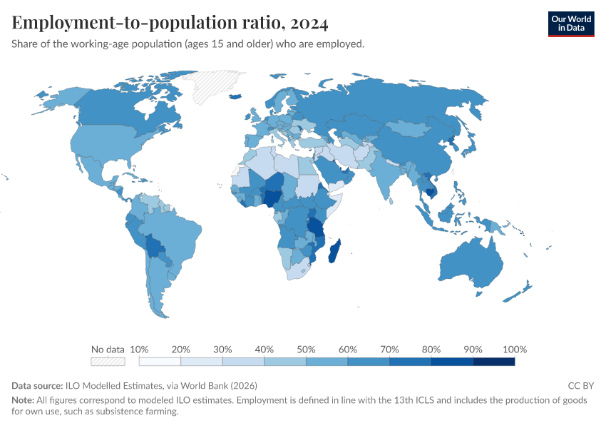 “Data Page: Employment-to-population ratio”. Our World in Data (2026). Data adapted from ILO Modelled Estimates, via World Bank. Retrieved from https://archive.ourworldindata.org/20260203-104517/grapher/employment-to-population-ratio.html [online resource] (archived on February 3, 2026).How to cite this data
