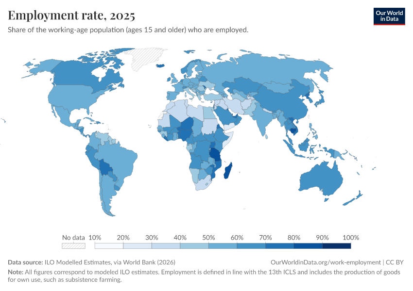 ILO Modelled Estimates, via World Bank (2026) – processed by Our World in Data. “Employment rate – ILO” [dataset]. ILO Modelled Estimates, via World Bank, “World Development Indicators 125” [original data]. Retrieved April 5, 2026 from https://archive.ourworldindata.org/20260304-094028/grapher/employment-to-population-ratio.html (archived on March 4, 2026).Download