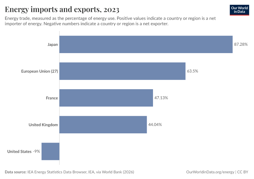 “Data Page: Energy imports and exports”. Our World in Data (2026). Data adapted from IEA Energy Statistics Data Browser, IEA, via World Bank. Retrieved from https://archive.ourworldindata.org/20260417-112857/grapher/energy-imports-and-exports-energy-use.html [online resource] (archived on April 17, 2026).How to cite this data