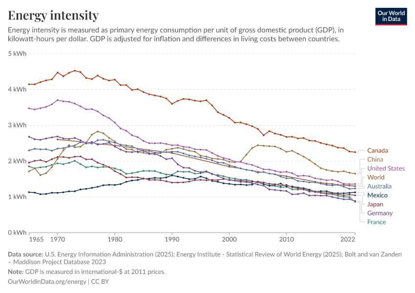 U.S. Energy Information Administration (2025); Energy Institute - Statistical Review of World Energy (2025); Bolt and van Zanden – Maddison Project Database 2023 – with major processing by Our World in Data. “Primary energy consumption per GDP” [dataset]. U.S. Energy Information Administration, “International Energy Data”; Energy Institute, “Statistical Review of World Energy”; Bolt and van Zanden, “Maddison Project Database 2023” [original data]. Retrieved April 4, 2026 from https://archive.ourworldindata.org/20260304-094028/grapher/energy-intensity.html (archived on March 4, 2026).Download