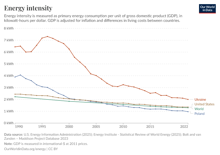 U.S. Energy Information Administration (2025); Energy Institute - Statistical Review of World Energy (2025); Bolt and van Zanden – Maddison Project Database 2023 – with major processing by Our World in Data. “Primary energy consumption per GDP” [dataset]. U.S. Energy Information Administration, “International Energy Data”; Energy Institute, “Statistical Review of World Energy”; Bolt and van Zanden, “Maddison Project Database 2023” [original data]. Retrieved December 7, 2025 from https://archive.ourworldindata.org/20251111-144738/grapher/energy-intensity.html (archived on November 11, 2025).