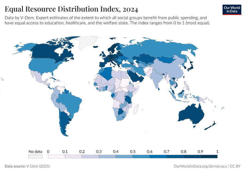 V-Dem (2025) – processed by Our World in Data. “Equal resource distribution index – V-Dem” [dataset]. V-Dem, “Democracy report v15” [original data]. Retrieved December 17, 2025 from https://archive.ourworldindata.org/20251209-133038/grapher/equal-resource-distribution-index.html (archived on December 9, 2025).