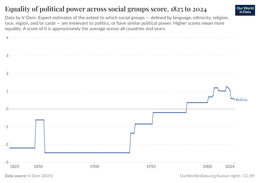 V-Dem (2025) – processed by Our World in Data. “Equality of political power across social groups – V-Dem” [dataset]. V-Dem, “Democracy report v15” [original data]. Retrieved December 5, 2025 from https://archive.ourworldindata.org/20250925-233948/grapher/equality-of-political-power-across-social-groups-score.html (archived on September 25, 2025).