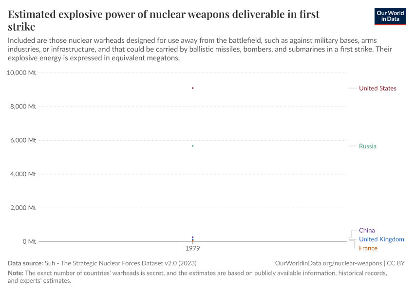 “Data Page: Estimated explosive power of nuclear weapons deliverable in first strike”, part of the following publication: Bastian Herre, Pablo Rosado, and Max Roser (2024) - “Nuclear Weapons”. Data adapted from Suh. Retrieved from https://archive.ourworldindata.org/20250909-093708/grapher/estimated-megatons-of-nuclear-weapons-deliverable-in-first-strike.html [online resource] (archived on September 9, 2025).How to cite this data