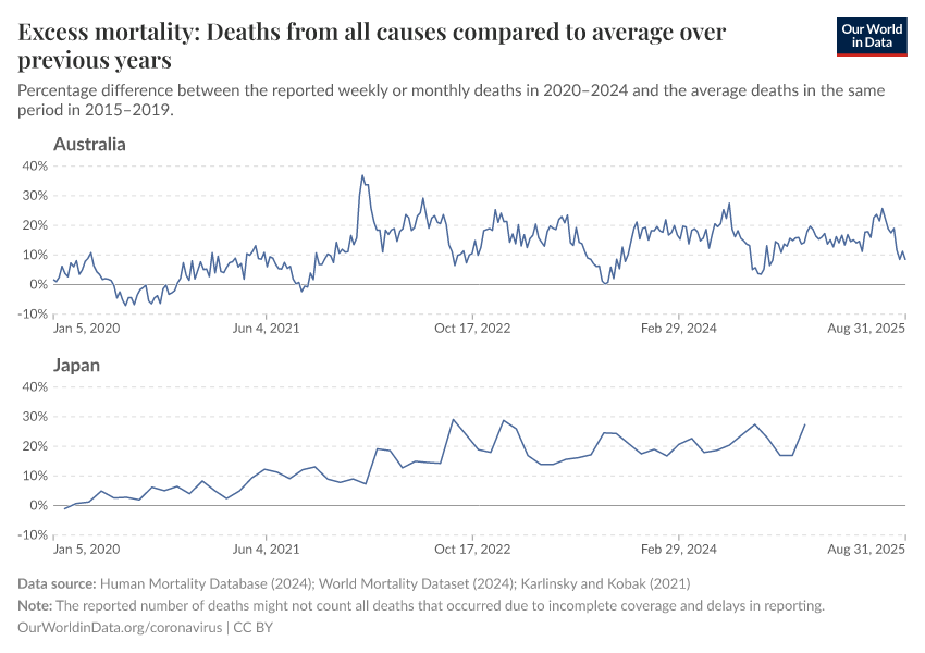 “Data Page: Excess mortality: Deaths from all causes compared to average over previous years”. Our World in Data (2025). Data adapted from Human Mortality Database, World Mortality Database. Retrieved from https://archive.ourworldindata.org/20251207-063327/grapher/excess-mortality-p-scores-average-baseline.html [online resource] (archived on December 7, 2025).How to cite this data