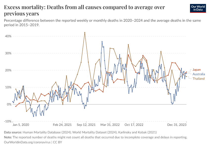 Human Mortality Database; World Mortality Dataset (2024); Karlinsky and Kobak (2021); Human Mortality Database (2025); World Mortality Database (2024) – processed by Our World in Data. “Excess mortality: Deaths from all causes compared to average over previous years” [dataset]. Human Mortality Database, “Human Mortality Database”; World Mortality Database, “World Mortality Database” [original data]. Retrieved April 4, 2026 from https://archive.ourworldindata.org/20260403-063310/grapher/excess-mortality-p-scores-average-baseline.html (archived on April 3, 2026).Download
