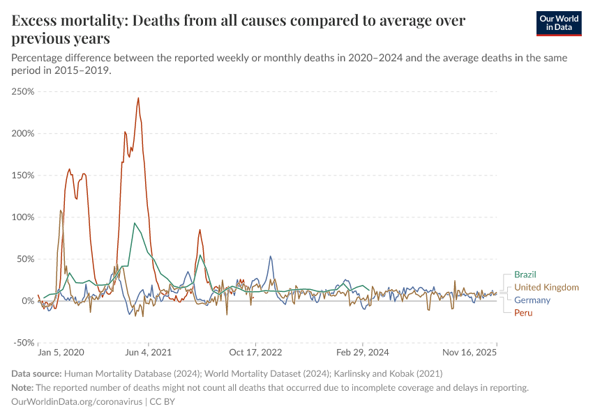 “Data Page: Excess mortality: Deaths from all causes compared to average over previous years”. Our World in Data (2025). Data adapted from Human Mortality Database, World Mortality Database. Retrieved from https://archive.ourworldindata.org/20251211-063340/grapher/excess-mortality-p-scores-average-baseline.html [online resource] (archived on December 11, 2025).How to cite this data