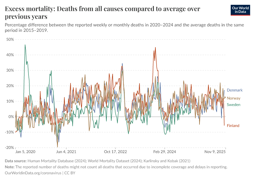 “Data Page: Excess mortality: Deaths from all causes compared to average over previous years”. Our World in Data (2025). Data adapted from Human Mortality Database, World Mortality Database. Retrieved from https://archive.ourworldindata.org/20251222-063248/grapher/excess-mortality-p-scores-average-baseline.html [online resource] (archived on December 22, 2025).How to cite this data