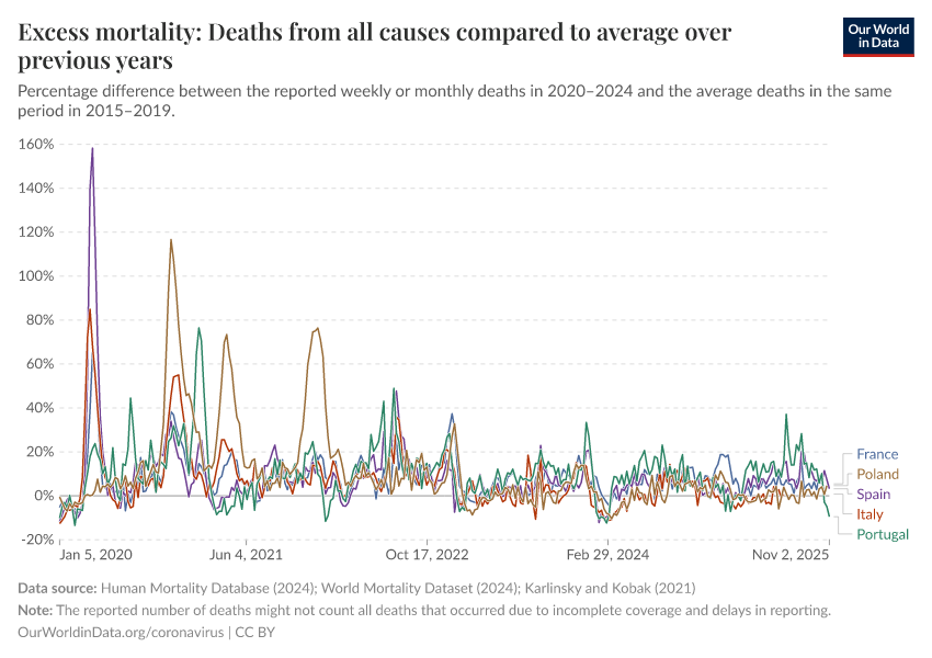 “Data Page: Excess mortality: Deaths from all causes compared to average over previous years”. Our World in Data (2025). Data adapted from Human Mortality Database, World Mortality Database. Retrieved from https://archive.ourworldindata.org/20251211-063340/grapher/excess-mortality-p-scores-average-baseline.html [online resource] (archived on December 11, 2025).