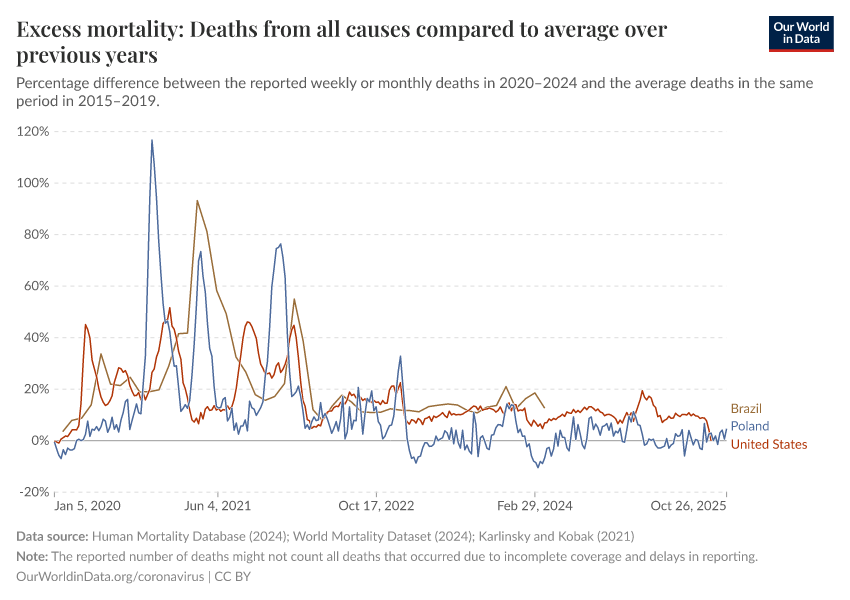 Human Mortality Database; World Mortality Dataset (2024); Karlinsky and Kobak (2021); Human Mortality Database (2025); World Mortality Database (2024) – processed by Our World in Data. “Excess mortality: Deaths from all causes compared to average over previous years” [dataset]. Human Mortality Database, “Human Mortality Database”; World Mortality Database, “World Mortality Database” [original data]. Retrieved December 16, 2025 from https://archive.ourworldindata.org/20251215-063346/grapher/excess-mortality-p-scores-average-baseline.html (archived on December 15, 2025).