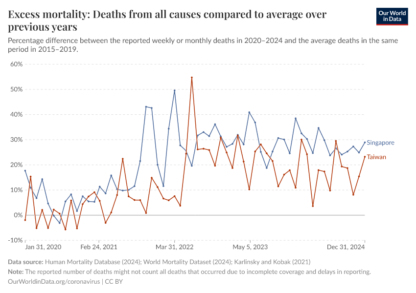Human Mortality Database; World Mortality Dataset (2024); Karlinsky and Kobak (2021); Human Mortality Database (2025); World Mortality Database (2024) – processed by Our World in Data. “Excess mortality: Deaths from all causes compared to average over previous years” [dataset]. Human Mortality Database, “Human Mortality Database”; World Mortality Database, “World Mortality Database” [original data]. Retrieved December 19, 2025 from https://archive.ourworldindata.org/20251219-063428/grapher/excess-mortality-p-scores-average-baseline.html (archived on December 19, 2025).