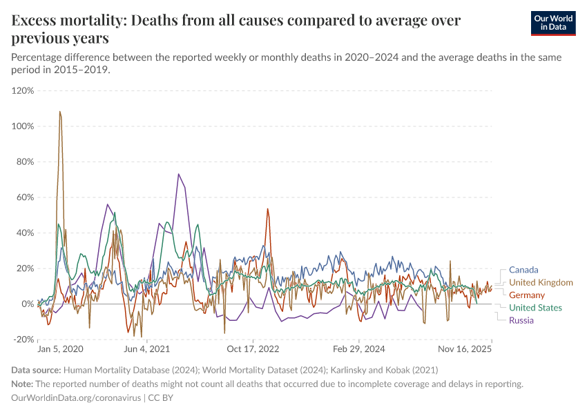 “Data Page: Excess mortality: Deaths from all causes compared to average over previous years”. Our World in Data (2025). Data adapted from Human Mortality Database, World Mortality Database. Retrieved from https://archive.ourworldindata.org/20251205-063407/grapher/excess-mortality-p-scores-average-baseline.html [online resource] (archived on December 5, 2025).How to cite this data