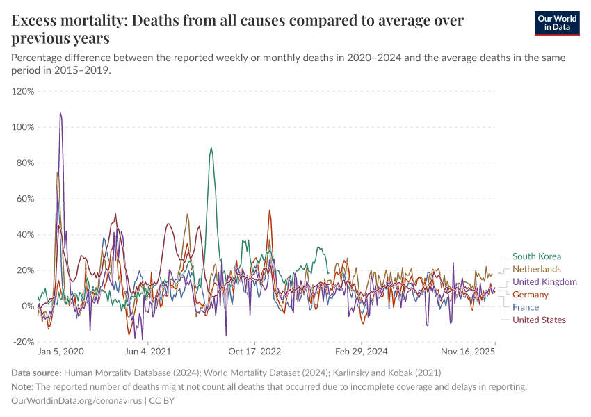 Human Mortality Database; World Mortality Dataset (2024); Karlinsky and Kobak (2021); Human Mortality Database (2025); World Mortality Database (2024) – processed by Our World in Data. “Excess mortality: Deaths from all causes compared to average over previous years” [dataset]. Human Mortality Database, “Human Mortality Database”; World Mortality Database, “World Mortality Database” [original data]. Retrieved December 8, 2025 from https://archive.ourworldindata.org/20251208-091333/grapher/excess-mortality-p-scores-average-baseline.html (archived on December 8, 2025).
