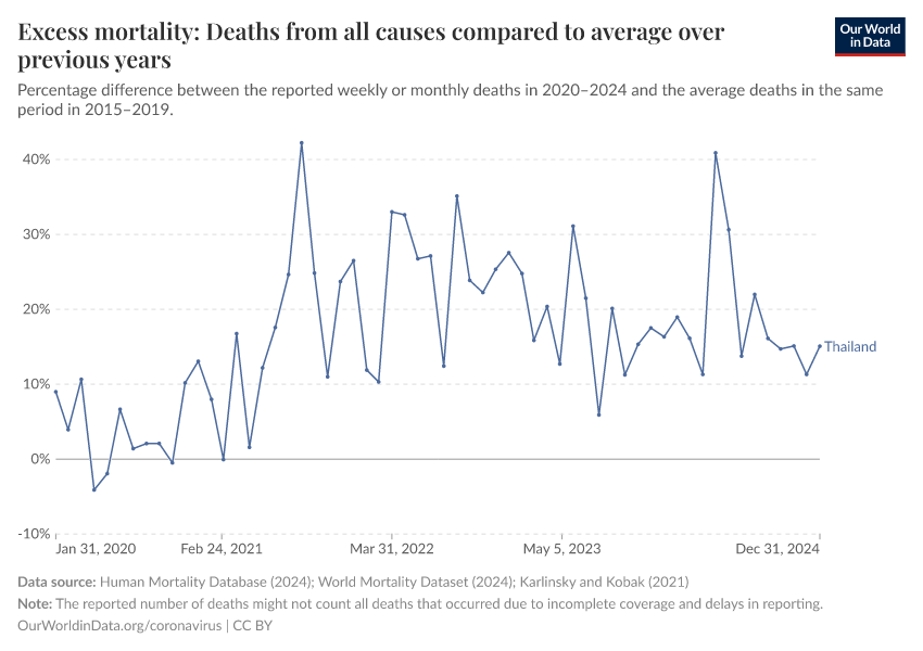 Human Mortality Database; World Mortality Dataset (2024); Karlinsky and Kobak (2021); Human Mortality Database (2025); World Mortality Database (2024) – processed by Our World in Data. “Excess mortality: Deaths from all causes compared to average over previous years” [dataset]. Human Mortality Database, “Human Mortality Database”; World Mortality Database, “World Mortality Database” [original data]. Retrieved December 20, 2025 from https://archive.ourworldindata.org/20251220-063401/grapher/excess-mortality-p-scores-average-baseline.html (archived on December 20, 2025).
