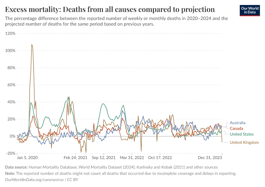 Human Mortality Database; World Mortality Dataset (2024); Karlinsky and Kobak (2021); Human Mortality Database (2025); World Mortality Database (2024); Karlinsky & Kobak (2024) – processed by Our World in Data. “Excess mortality: Deaths from all causes compared to projection” [dataset]. Human Mortality Database, “Human Mortality Database”; World Mortality Database, “World Mortality Database”; Karlinsky & Kobak, “Excess mortality during the COVID-19 pandemic” [original data]. Retrieved December 8, 2025 from https://archive.ourworldindata.org/20251208-091333/grapher/excess-mortality-p-scores-projected-baseline.html (archived on December 8, 2025).