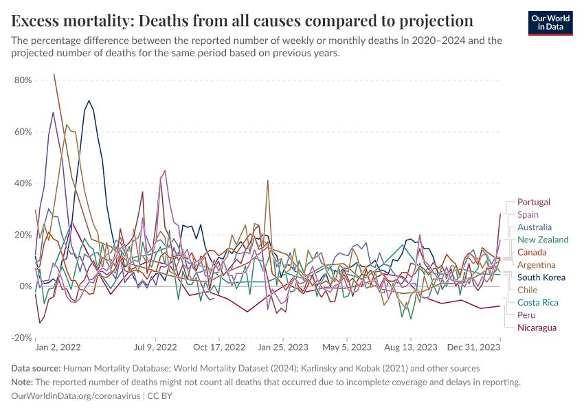 Human Mortality Database; World Mortality Dataset (2024); Karlinsky and Kobak (2021); Human Mortality Database (2025); World Mortality Database (2024); Karlinsky & Kobak (2024) – processed by Our World in Data. “Excess mortality: Deaths from all causes compared to projection” [dataset]. Human Mortality Database, “Human Mortality Database”; World Mortality Database, “World Mortality Database”; Karlinsky & Kobak, “Excess mortality during the COVID-19 pandemic” [original data]. Retrieved January 5, 2026 from https://archive.ourworldindata.org/20260104-063511/grapher/excess-mortality-p-scores-projected-baseline.html (archived on January 4, 2026).