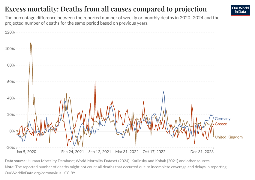 “Data Page: Excess mortality: Deaths from all causes compared to projection”. Our World in Data (2025). Data adapted from Human Mortality Database, World Mortality Database, Karlinsky & Kobak. Retrieved from https://archive.ourworldindata.org/20251217-063315/grapher/excess-mortality-p-scores-projected-baseline.html [online resource] (archived on December 17, 2025).How to cite this data