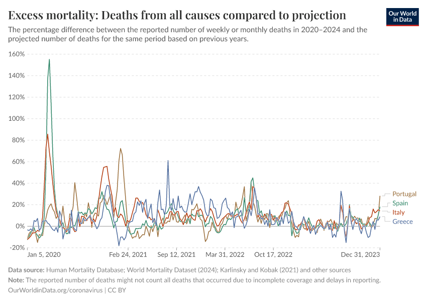 “Data Page: Excess mortality: Deaths from all causes compared to projection”. Our World in Data (2025). Data adapted from Human Mortality Database, World Mortality Database, Karlinsky & Kobak. Retrieved from https://archive.ourworldindata.org/20251204-063323/grapher/excess-mortality-p-scores-projected-baseline.html [online resource] (archived on December 4, 2025).