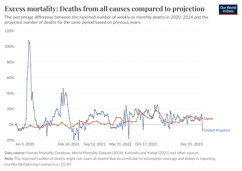 “Data Page: Excess mortality: Deaths from all causes compared to projection”. Our World in Data (2026). Data adapted from Human Mortality Database, World Mortality Database, Karlinsky & Kobak. Retrieved from https://archive.ourworldindata.org/20260404-063300/grapher/excess-mortality-p-scores-projected-baseline.html [online resource] (archived on April 4, 2026).How to cite this data