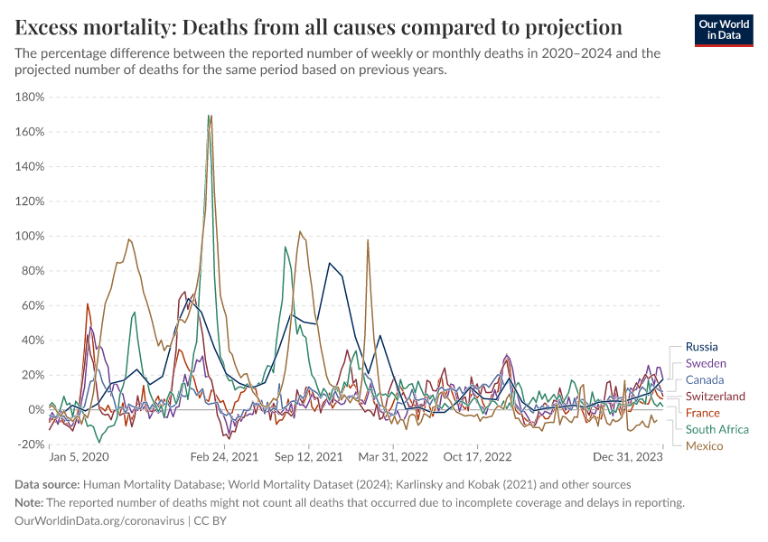 Human Mortality Database; World Mortality Dataset (2024); Karlinsky and Kobak (2021) and other sources – processed by Our World in DataFull citation