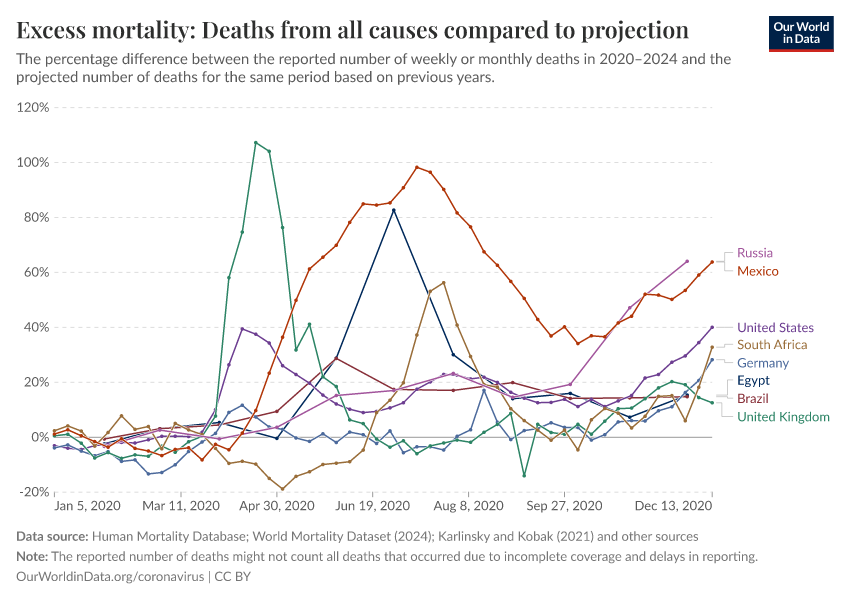 Human Mortality Database; World Mortality Dataset (2024); Karlinsky and Kobak (2021); Human Mortality Database (2025); World Mortality Database (2024); Karlinsky & Kobak (2024) – processed by Our World in Data. “Excess mortality: Deaths from all causes compared to projection” [dataset]. Human Mortality Database, “Human Mortality Database”; World Mortality Database, “World Mortality Database”; Karlinsky & Kobak, “Excess mortality during the COVID-19 pandemic” [original data]. Retrieved January 15, 2026 from https://archive.ourworldindata.org/20260115-063318/grapher/excess-mortality-p-scores-projected-baseline.html (archived on January 15, 2026).