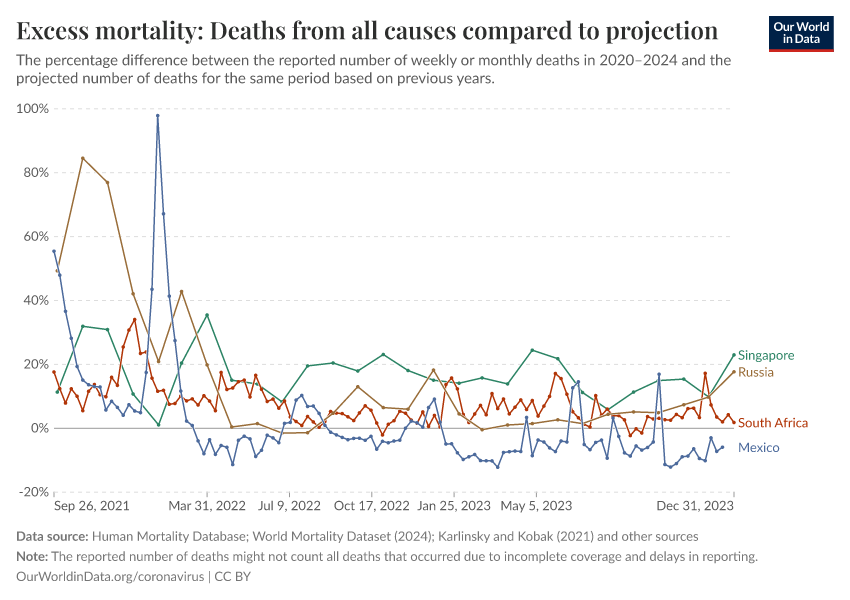 Human Mortality Database; World Mortality Dataset (2024); Karlinsky and Kobak (2021) and other sources – processed by Our World in DataFull citation