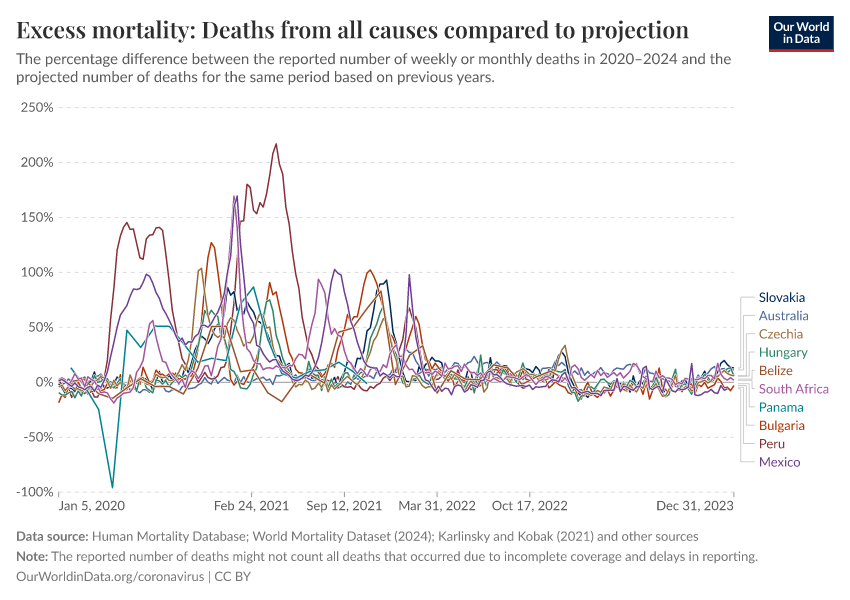 Human Mortality Database; World Mortality Dataset (2024); Karlinsky and Kobak (2021); Human Mortality Database (2025); World Mortality Database (2024); Karlinsky & Kobak (2024) – processed by Our World in Data. “Excess mortality: Deaths from all causes compared to projection” [dataset]. Human Mortality Database, “Human Mortality Database”; World Mortality Database, “World Mortality Database”; Karlinsky & Kobak, “Excess mortality during the COVID-19 pandemic” [original data]. Retrieved January 16, 2026 from https://archive.ourworldindata.org/20260116-063306/grapher/excess-mortality-p-scores-projected-baseline.html (archived on January 16, 2026).
