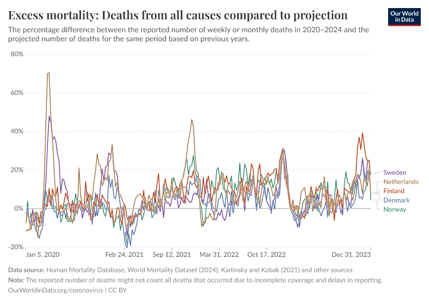 Human Mortality Database; World Mortality Dataset (2024); Karlinsky and Kobak (2021); Human Mortality Database (2025); World Mortality Database (2024); Karlinsky & Kobak (2024) – processed by Our World in Data. “Excess mortality: Deaths from all causes compared to projection” [dataset]. Human Mortality Database, “Human Mortality Database”; World Mortality Database, “World Mortality Database”; Karlinsky & Kobak, “Excess mortality during the COVID-19 pandemic” [original data]. Retrieved December 18, 2025 from https://archive.ourworldindata.org/20251217-063315/grapher/excess-mortality-p-scores-projected-baseline.html (archived on December 17, 2025).