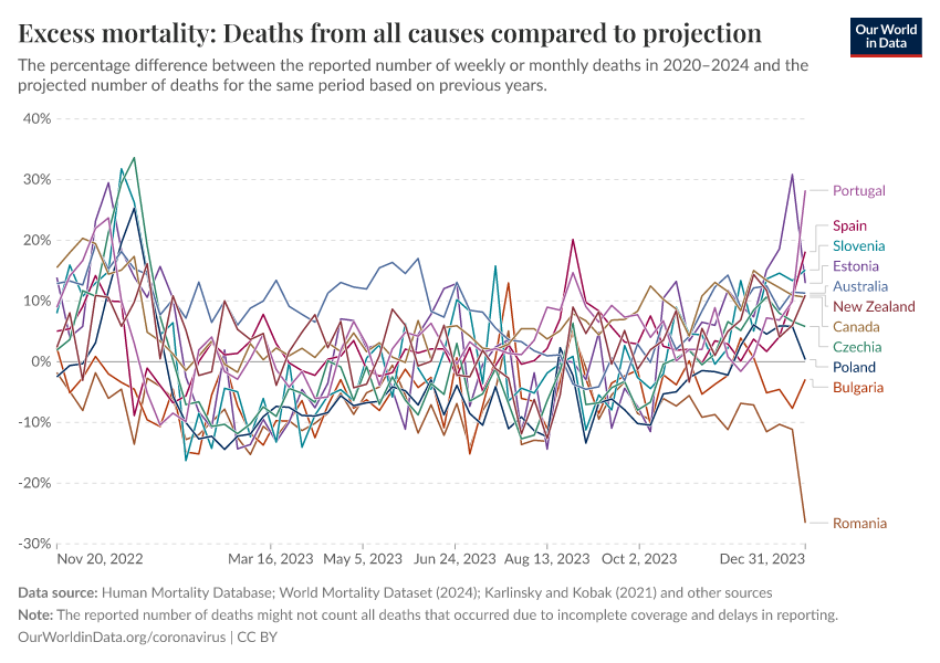 Human Mortality Database; World Mortality Dataset (2024); Karlinsky and Kobak (2021); Human Mortality Database (2025); World Mortality Database (2024); Karlinsky & Kobak (2024) – processed by Our World in Data. “Excess mortality: Deaths from all causes compared to projection” [dataset]. Human Mortality Database, “Human Mortality Database”; World Mortality Database, “World Mortality Database”; Karlinsky & Kobak, “Excess mortality during the COVID-19 pandemic” [original data]. Retrieved January 10, 2026 from https://archive.ourworldindata.org/20260110-063326/grapher/excess-mortality-p-scores-projected-baseline.html (archived on January 10, 2026).