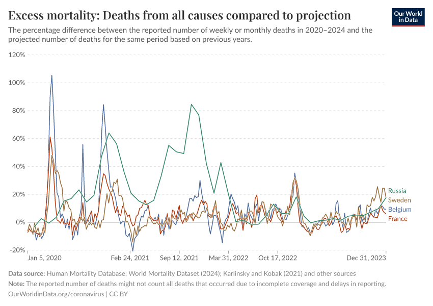 “Data Page: Excess mortality: Deaths from all causes compared to projection”. Our World in Data (2025). Data adapted from Human Mortality Database, World Mortality Database, Karlinsky & Kobak. Retrieved from https://archive.ourworldindata.org/20251212-063335/grapher/excess-mortality-p-scores-projected-baseline.html [online resource] (archived on December 12, 2025).How to cite this data