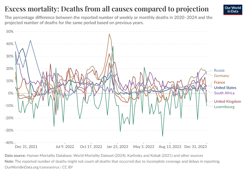 Human Mortality Database; World Mortality Dataset (2024); Karlinsky and Kobak (2021); Human Mortality Database (2025); World Mortality Database (2024); Karlinsky & Kobak (2024) – processed by Our World in Data. “Excess mortality: Deaths from all causes compared to projection” [dataset]. Human Mortality Database, “Human Mortality Database”; World Mortality Database, “World Mortality Database”; Karlinsky & Kobak, “Excess mortality during the COVID-19 pandemic” [original data]. Retrieved April 22, 2026 from https://archive.ourworldindata.org/20260421-063321/grapher/excess-mortality-p-scores-projected-baseline.html (archived on April 21, 2026).Download