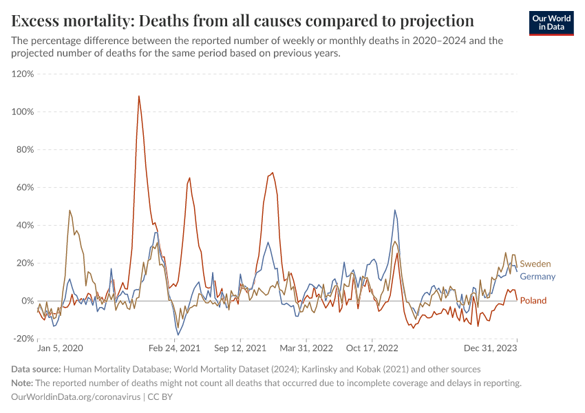“Data Page: Excess mortality: Deaths from all causes compared to projection”. Our World in Data (2025). Data adapted from Human Mortality Database, World Mortality Database, Karlinsky & Kobak. Retrieved from https://archive.ourworldindata.org/20251224-063337/grapher/excess-mortality-p-scores-projected-baseline.html [online resource] (archived on December 24, 2025).How to cite this data