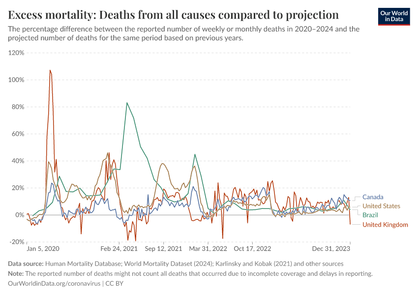 Human Mortality Database; World Mortality Dataset (2024); Karlinsky and Kobak (2021); Human Mortality Database (2025); World Mortality Database (2024); Karlinsky & Kobak (2024) – processed by Our World in Data. “Excess mortality: Deaths from all causes compared to projection” [dataset]. Human Mortality Database, “Human Mortality Database”; World Mortality Database, “World Mortality Database”; Karlinsky & Kobak, “Excess mortality during the COVID-19 pandemic” [original data]. Retrieved January 11, 2026 from https://archive.ourworldindata.org/20260111-063230/grapher/excess-mortality-p-scores-projected-baseline.html (archived on January 11, 2026).