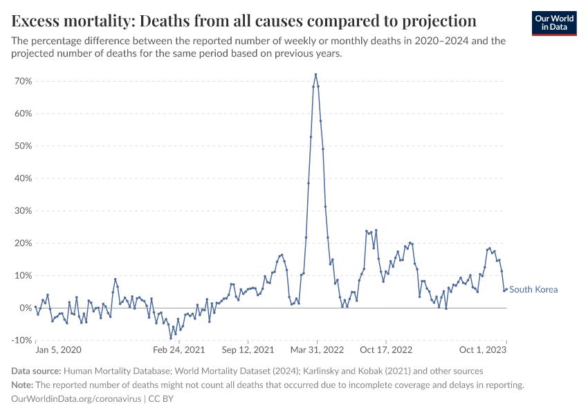 Human Mortality Database; World Mortality Dataset (2024); Karlinsky and Kobak (2021); Human Mortality Database (2025); World Mortality Database (2024); Karlinsky & Kobak (2024) – processed by Our World in Data. “Excess mortality: Deaths from all causes compared to projection” [dataset]. Human Mortality Database, “Human Mortality Database”; World Mortality Database, “World Mortality Database”; Karlinsky & Kobak, “Excess mortality during the COVID-19 pandemic” [original data]. Retrieved December 19, 2025 from https://archive.ourworldindata.org/20251219-063428/grapher/excess-mortality-p-scores-projected-baseline.html (archived on December 19, 2025).